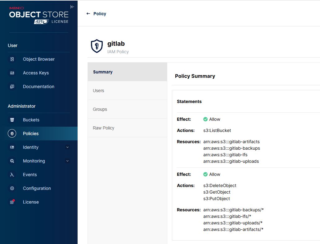 И добавляем пользователя gitlab-s3 к политике.